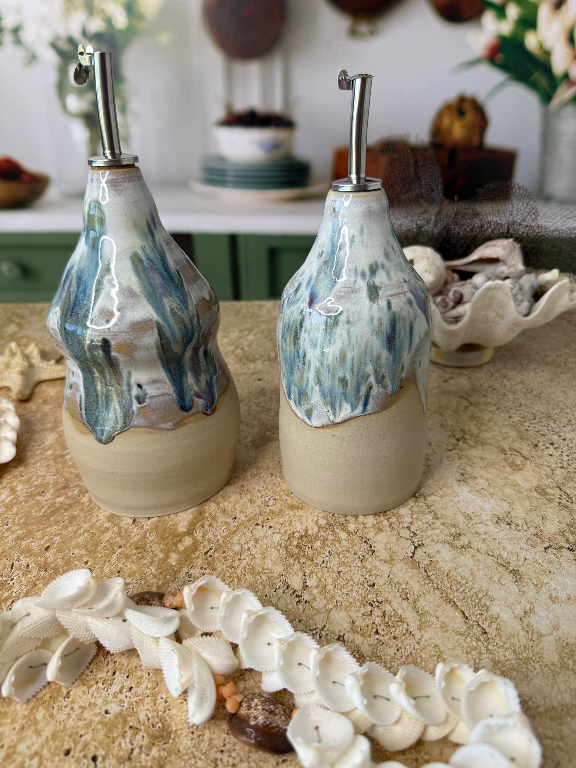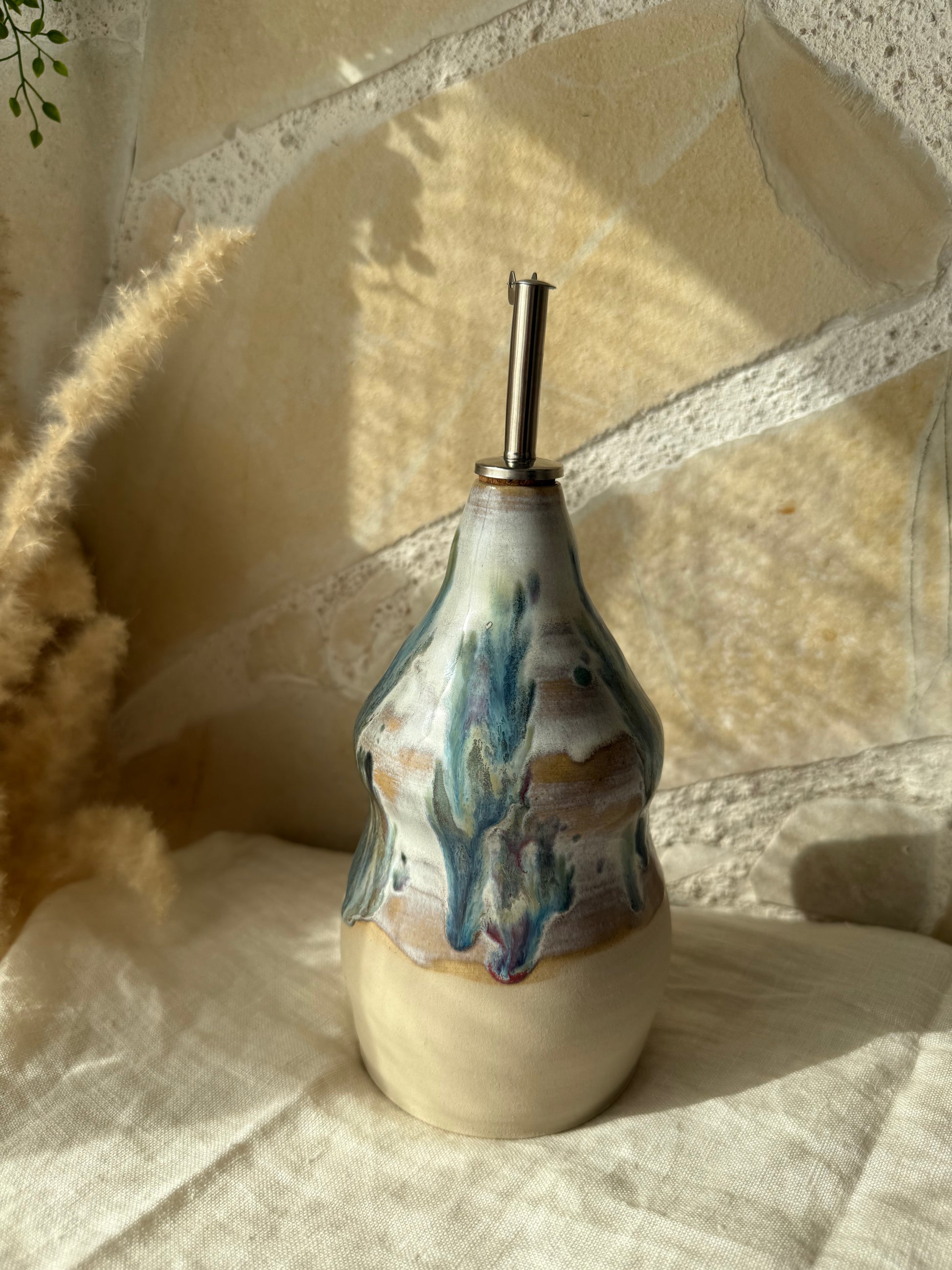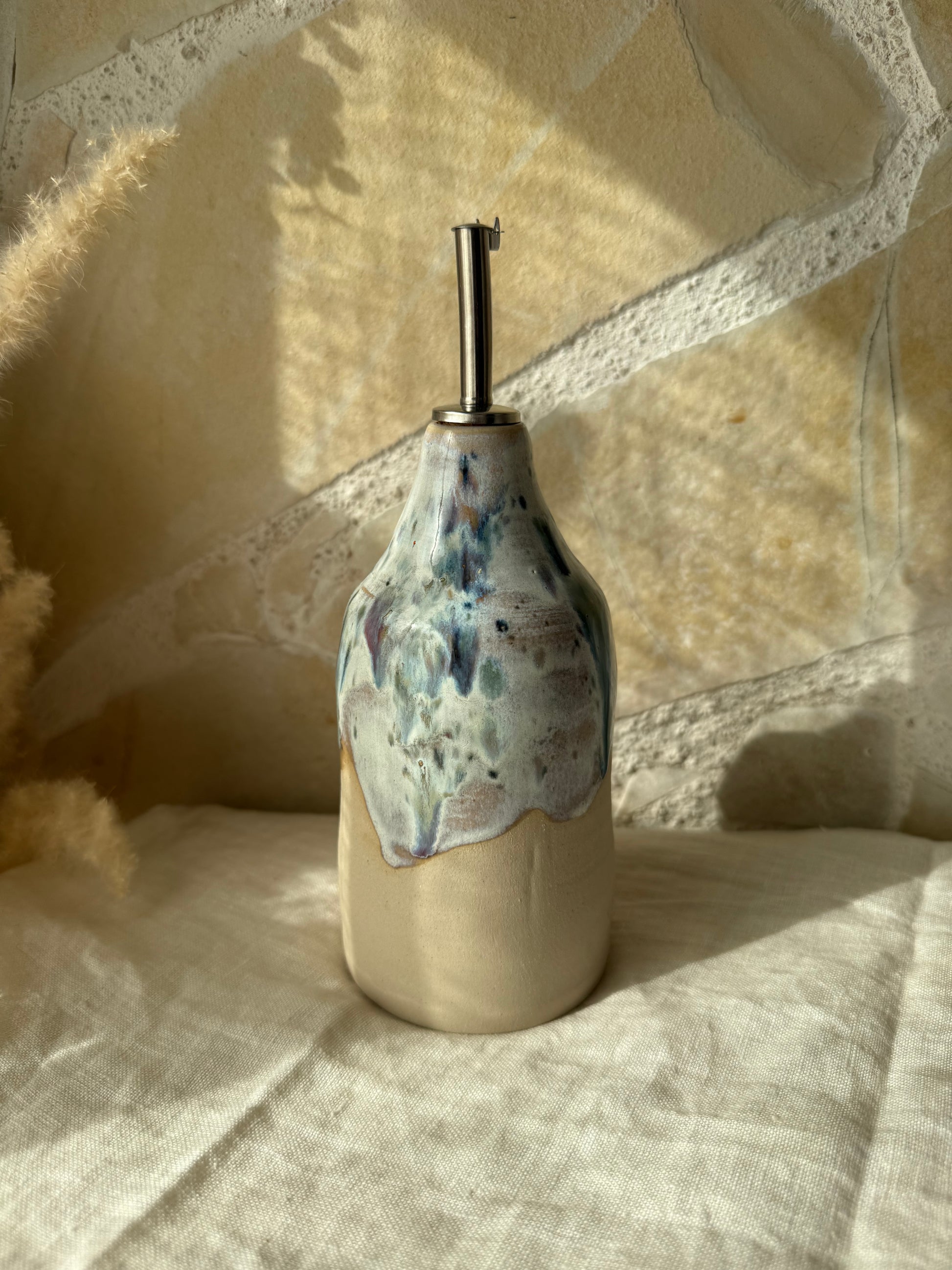 Découvrez notre huilier en grès pyrité, une pièce artisanale unique qui allie beauté et fonctionnalité. Fabriqué à la main, cet huilier est orné d'un émail aux nuances terreuses et subtiles, propres à chaque création.