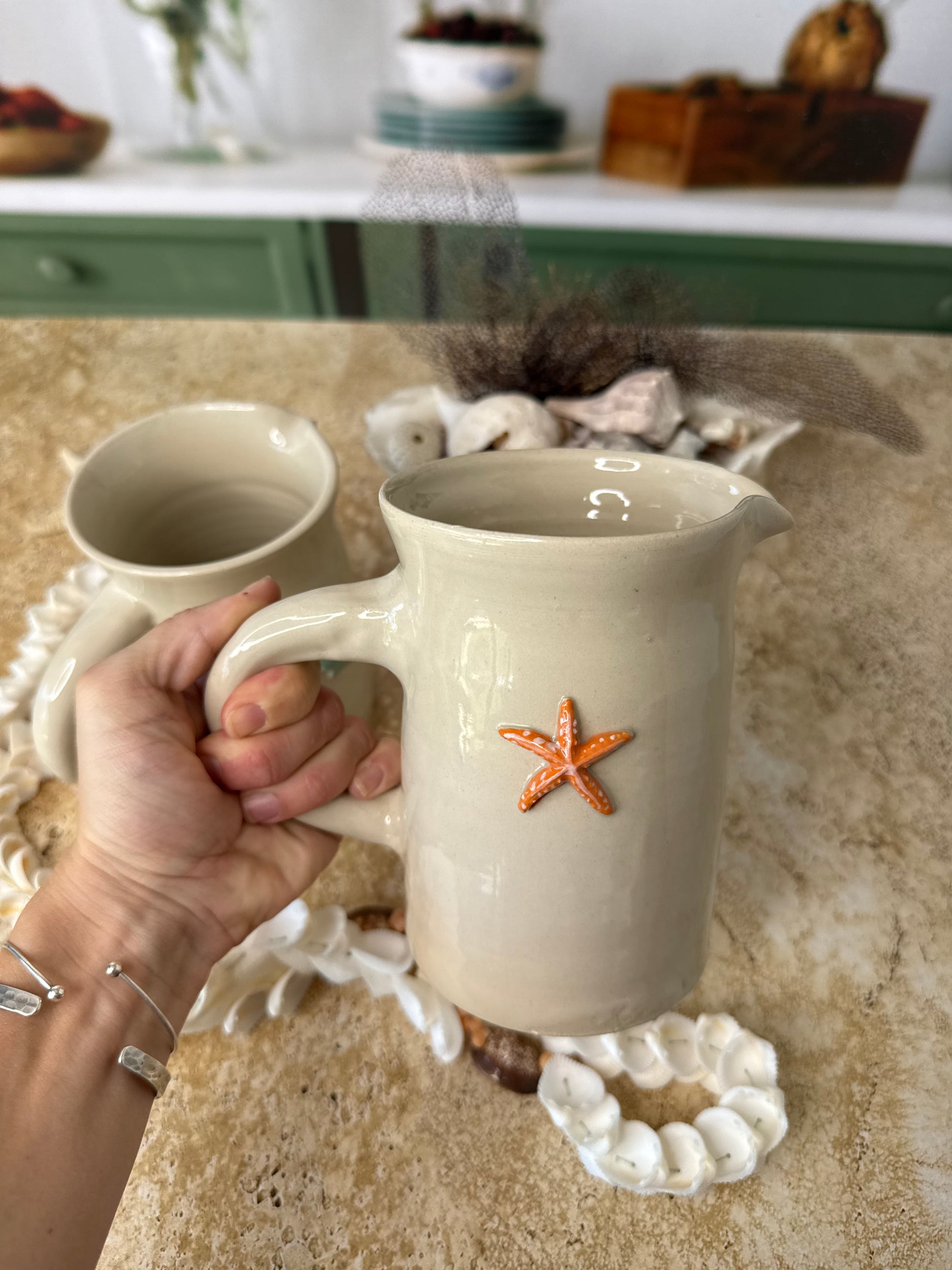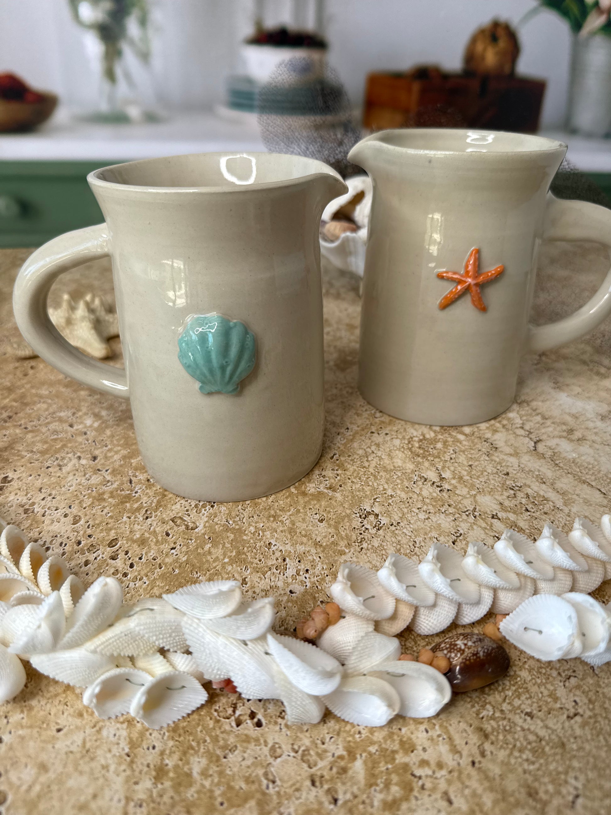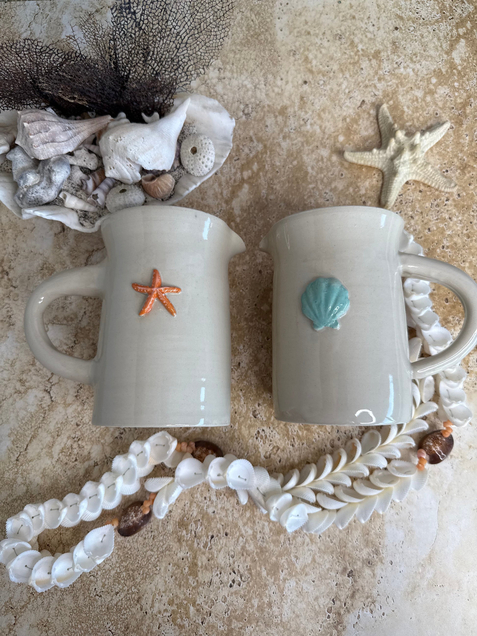 Découvrez notre petit pichet en grès, une pièce artisanale qui allie beauté et fonctionnalité. Fabriqué à la main, il est orné d'une étoile ou d'un coquillage en relief, créant un effet visuel et tactile unique.