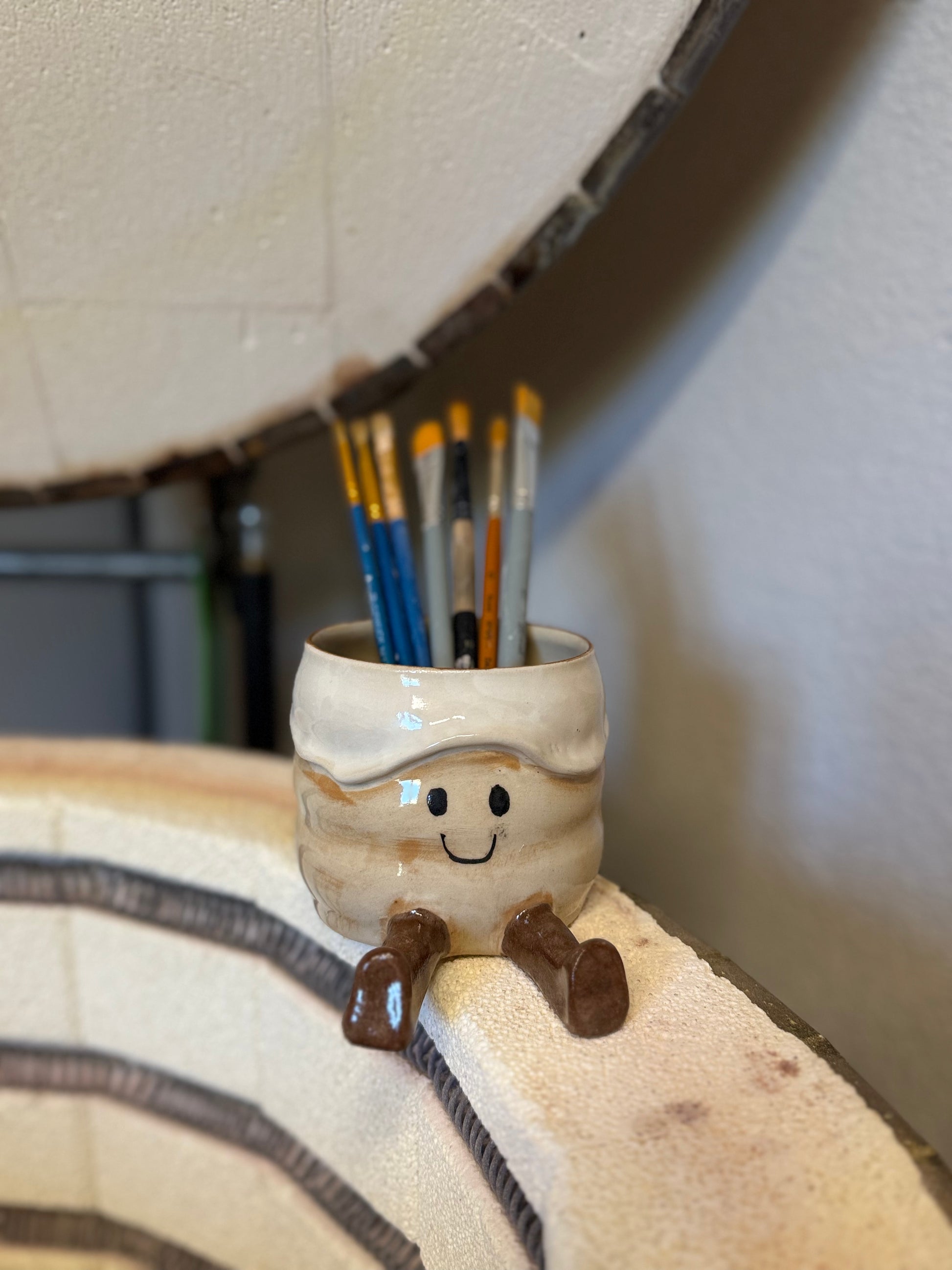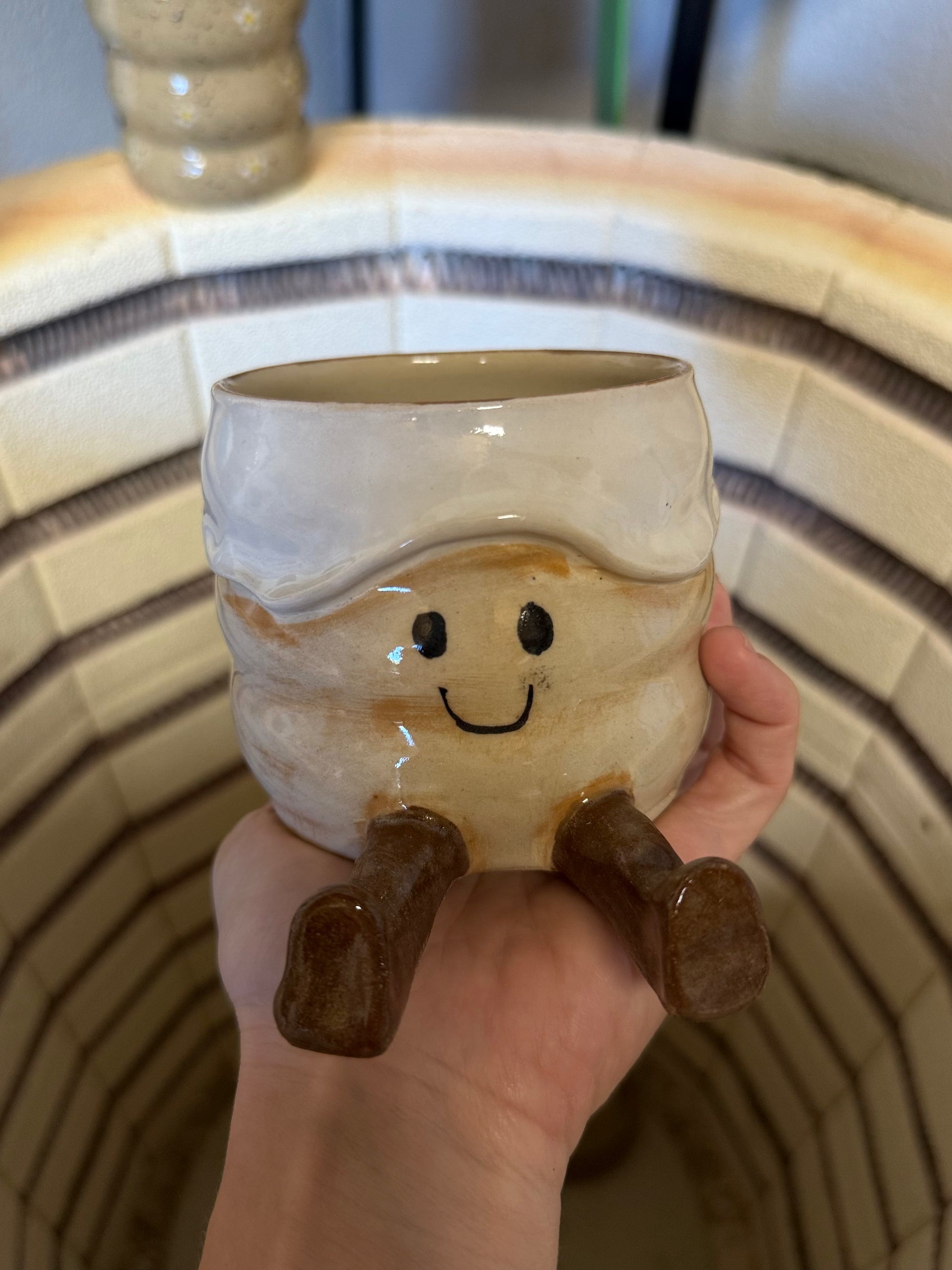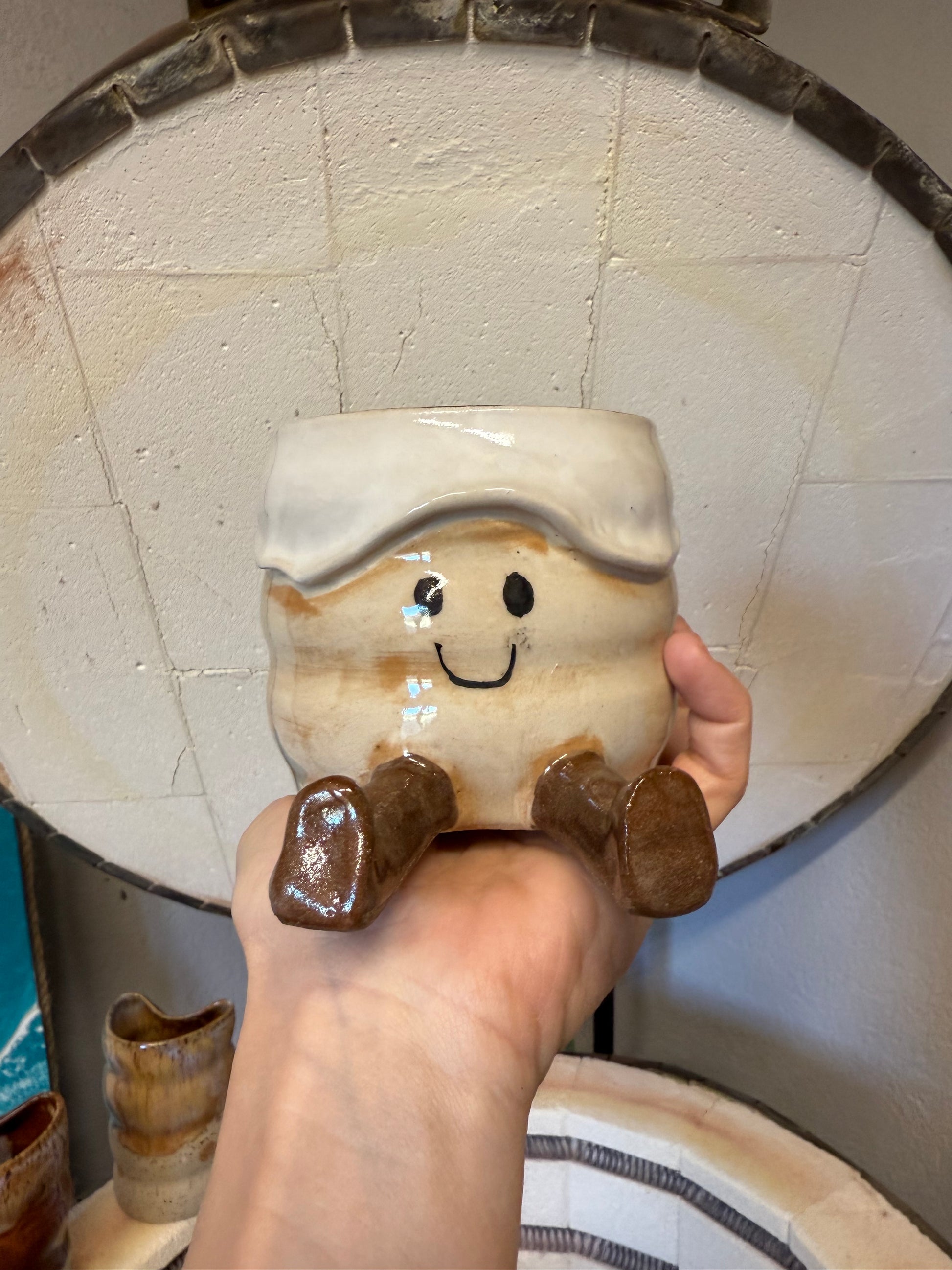 Inspiré de mes desserts d’hiver préférés, les cinnamon rolls, ce petit pot en grès blanc joue avec des nuances douces rappelant la cannelle et le sucre glace. Chaque pièce est modelée et peinte à la main, ce qui rend ses teintes uniques — entre beige doré et blanc poudré.